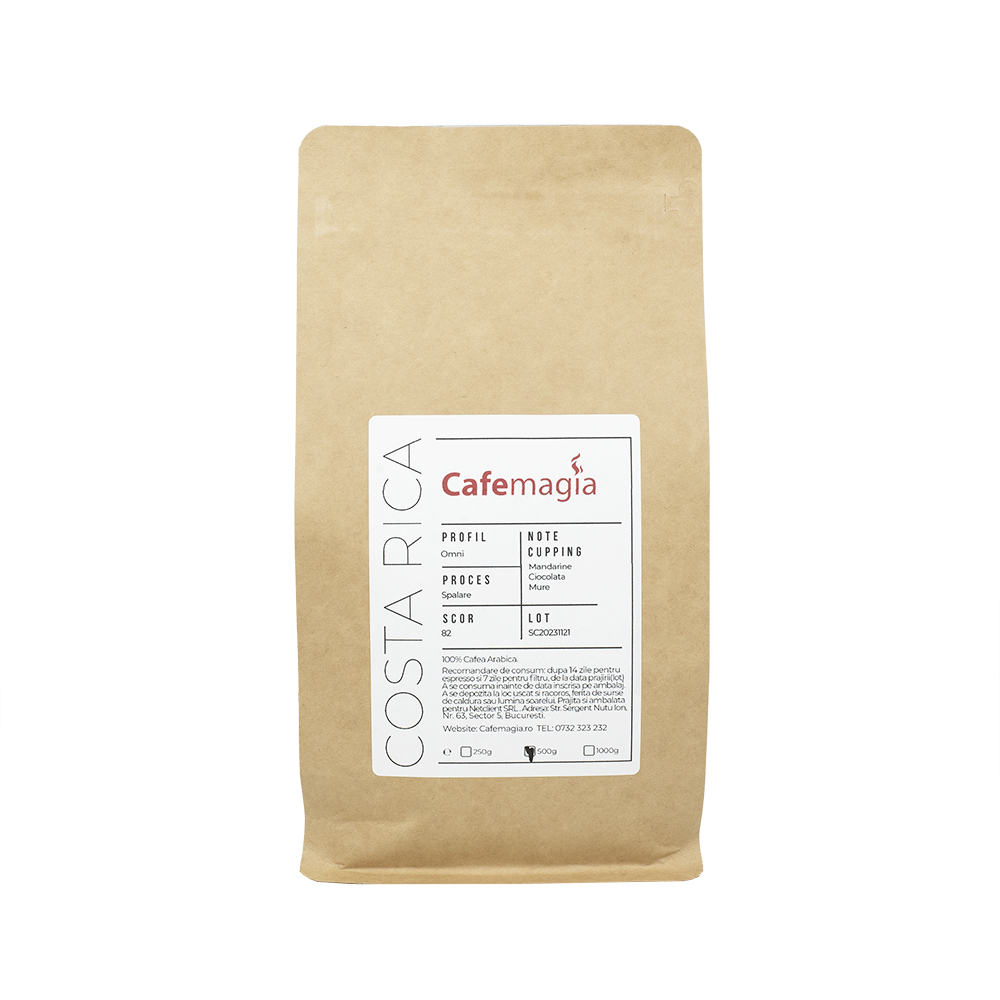 Cafemagia Costa Rica Tarrazu Proaspat Prajita este ambalată într-un pachet de 500 grame, cu un aspect atractiv și etichetă informativă. Pachetul asigură siguranța și prospețimea boabelor de cafea înainte de deschiderea acestuia.