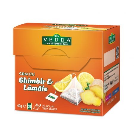 Vedda Ceai Piramida Ghimbir & Lămâie - 20 plicuri (2g): o combinație delicioasă de ghimbir picant și lămâie proaspătă, perfectă pentru stimularea imunității și revigorarea simțurilor.